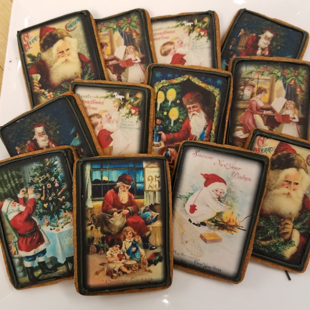 hand-iced caramelized sugar cookies with royal icing in myriad festive shapes