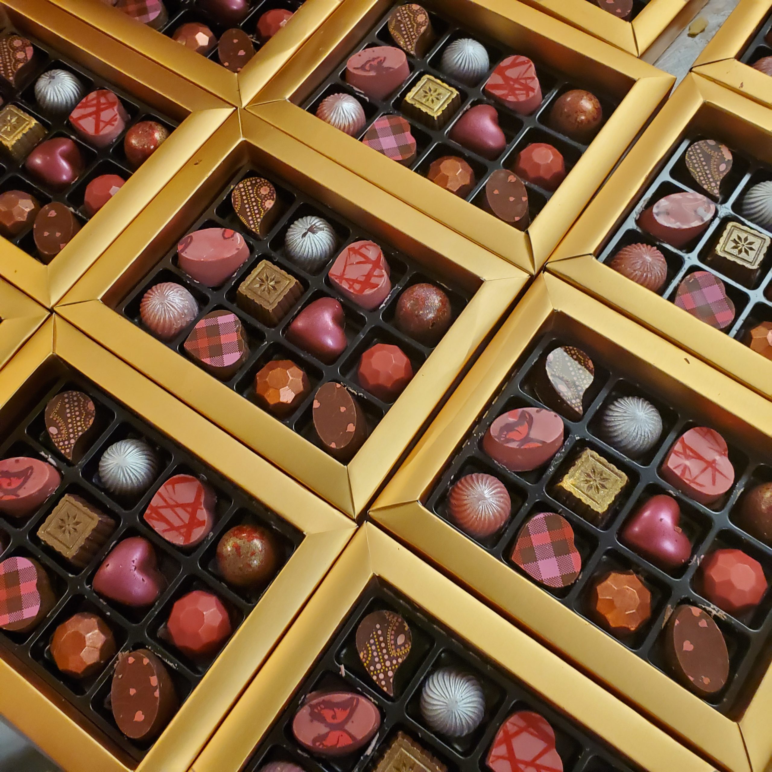 chocolate covered strawberries, shiny chocolate truffles, designer chocolate bars, liquid-center cordial cherries, flourless chocolate cake