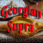cheesy bread boats, meat-filled dumplings, tomato-cucumber salad, eggplant-walnut rolls, fruit plov, kharcho stew, cherry cake