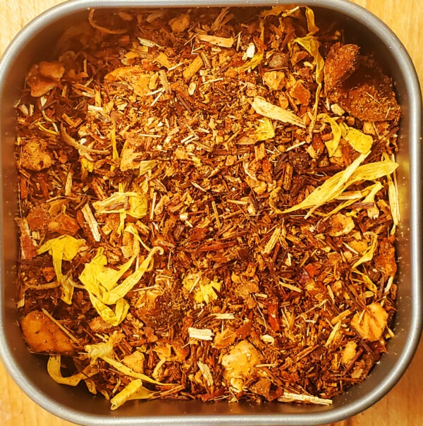 Treat yourself to this marvelous variation of our Caravanserai Herbal Chai, a remarkable blend inspired by the legendary caravanserai inns and trading posts along the ancient Silk Road. The Herbal Chai has big pieces of dried orange, apple, lemongrass, hibiscus, rose hips, whole star anise, cloves, ginger, cardamom, and more, which makes for a terrific pot of tea, but doesn’t fit very well in a tea bag. To make it suitable for solo sipping, we gave it a coarse grind and blended it with several of our favorite teas, and rooibos was the clear winner. The resulting cup is a rich copper-red, with notes of licorice, fruit and spice. Caffeine-free, suitable for any time of day or night.