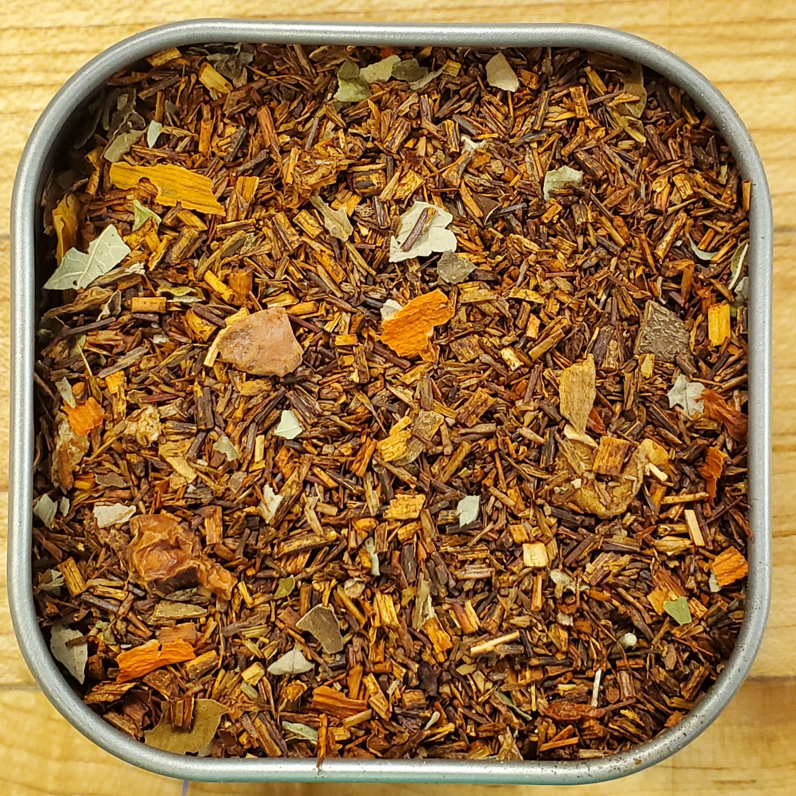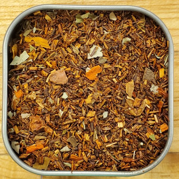 Ingredients: Rooibos, Cinnamon, Apple pieces, Lily flower petals, Blackberry leaves, Safflower petals, Pear pieces, Natural flavors (Organic Compliant).