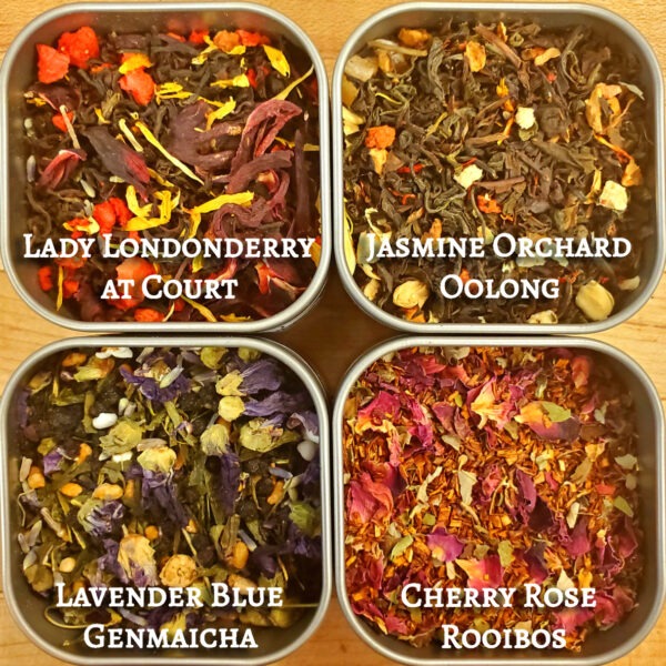 Cherry Rose Rooibos – This gorgeous blend mixes South African herbal rooibos with blackberry leaf and glamorous rose petals, and infuses them with the all-natural flavors of cherry and rose. As rooibos is caffeine-free, it’s a wonderful anytime beverage, and this brews up as lovely as a good night kiss.