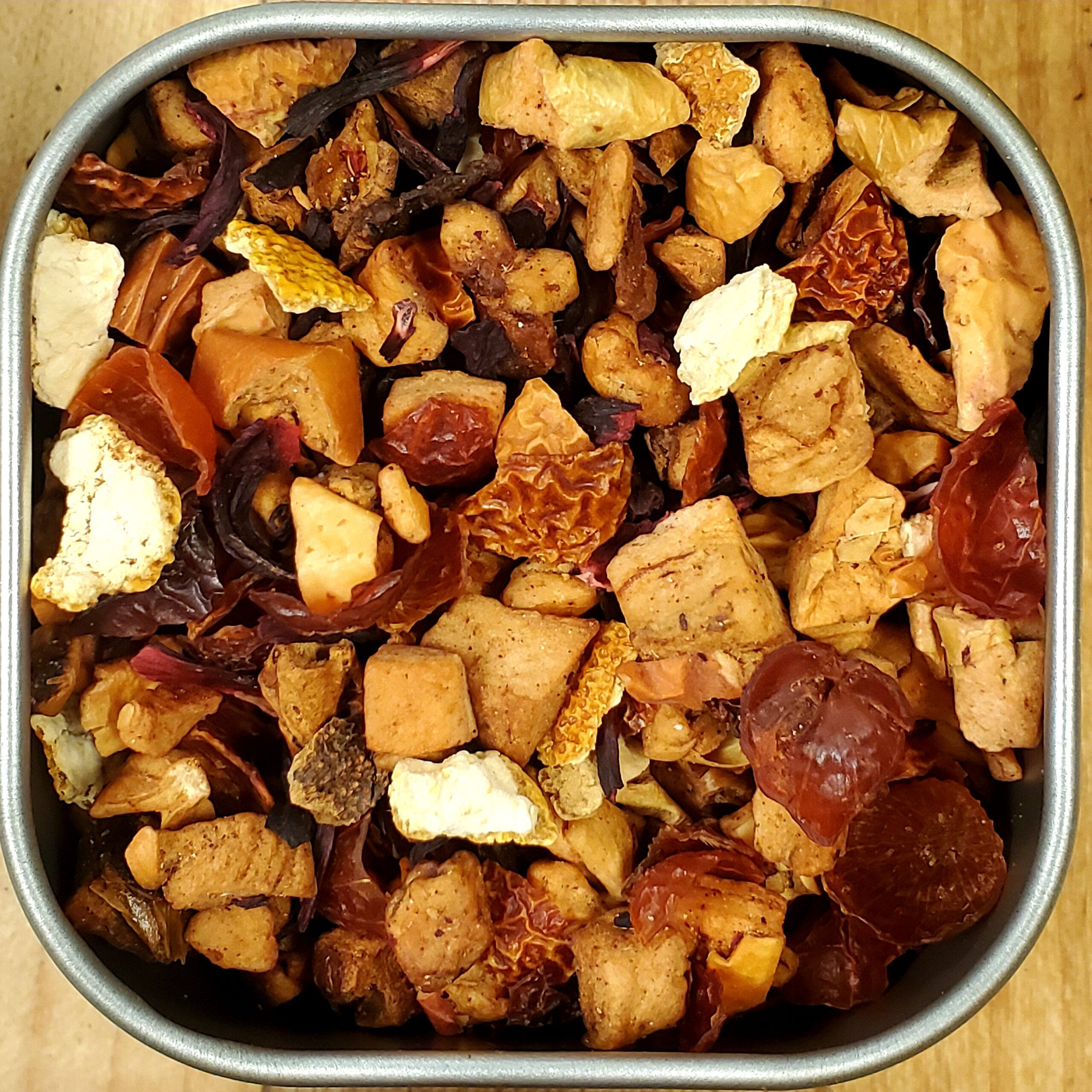 Contains: Apple pieces, Hibiscus petals, Rosehip + Orange pieces, Natural flavors (organic compliant).