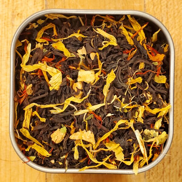 Black tea, Mango pieces, Ginger, Lime leaves, Papaya pieces, Calendula + Sunflower petals, Natural flavors (organic compliant).