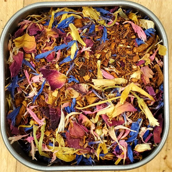 This blend is based on South Africa’s prized rooibos, which is naturally caffeine-free, richly flavorful, and laden with healthful herbs and nutrients, augmented with a touch of Kenyan black tea. It’s laden with wild rose, jasmine, cornflower, and calendula to create a warm, welcoming, and beautiful cup that is glorious both plain or with milk and sugar.
